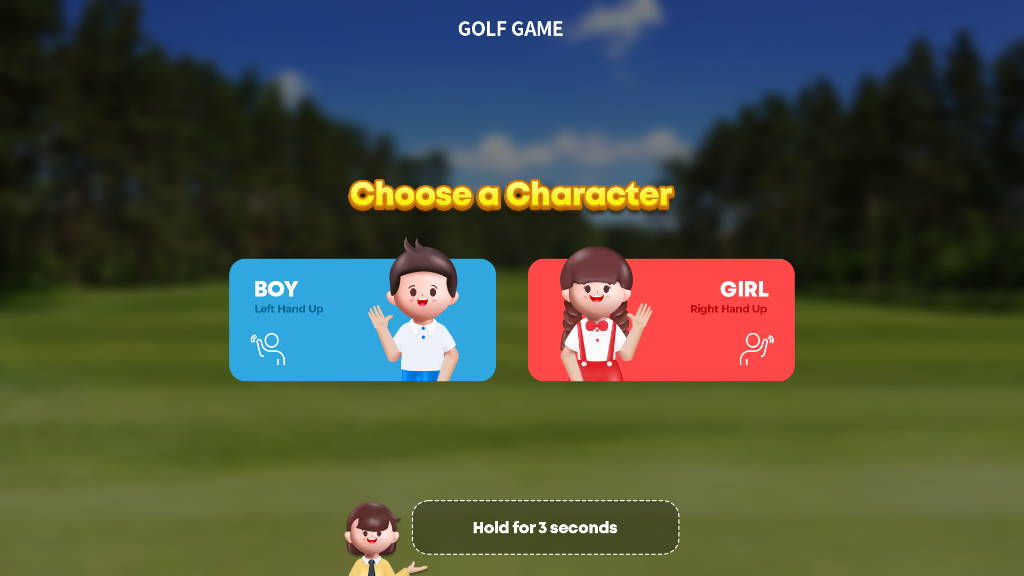 어린이들을 위한 직관적이고 즐거운 골프 게임 인터페이스 디자인. 모션 인식 기반의 캐릭터 선택 및 직관적인 게임 플레이 경험을 제공합니다.