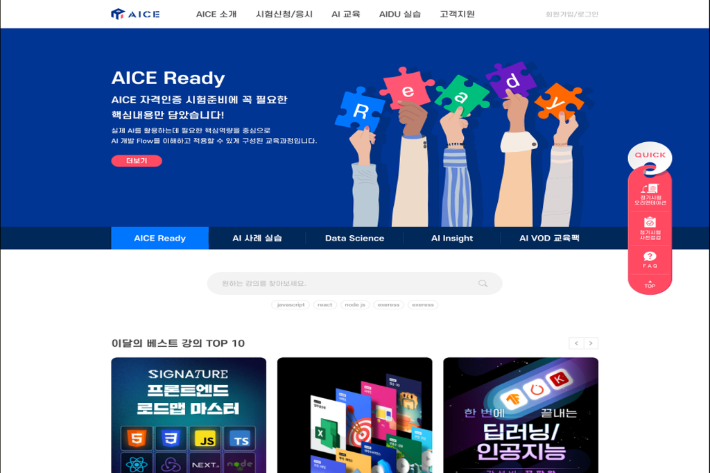 AI 인재 양성을 위한 KT AICE 자격인증 교육 및 시험 플랫폼의 사용자 경험(UX)과 인터페이스(UI) 고도화 작업. 학습 편의성과 전문성 강화를 위한 디자인 개선.