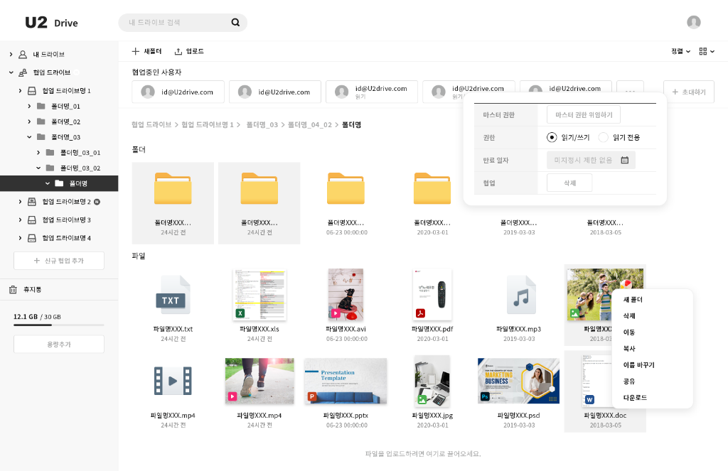 기업용 클라우드 저장소 및 협업 플랫폼. 대용량 파일 관리, 공유 권한 설정, 팀 협업 드라이브 등의 기능을 제공하며 현대적인 인터페이스와 효율적인 파일 관리 시스템을 갖추고 있습니다.