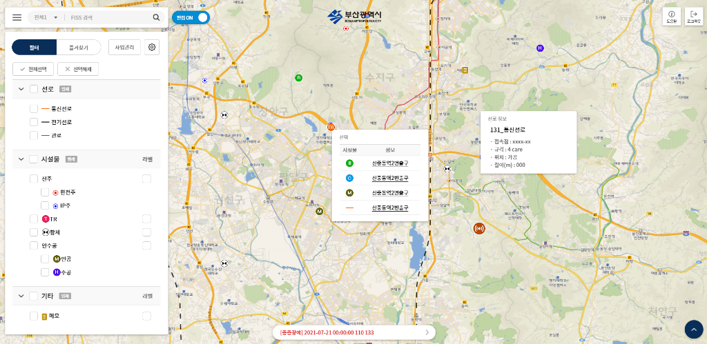 부산광역시 시설물 및 선로 관리를 위한 지능형 시설 관리 시스템(FISS). 지도 기반의 실시간 위치 추적, 시설물 상세 정보 조회 및 유지보수 관리 기능을 제공합니다.